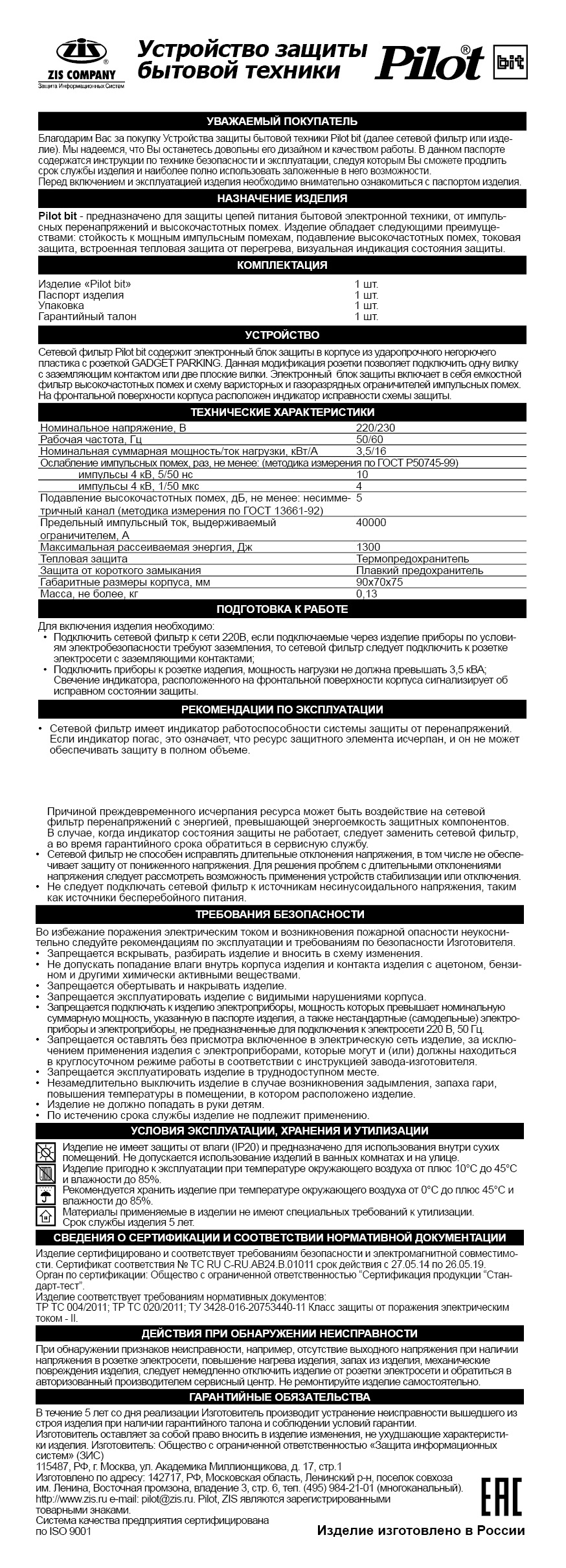 Сетевой фильтр Pilot bit USB отвечает всем современным требованиям российских стандартов в области электромагнитной совместимости и безопасности.